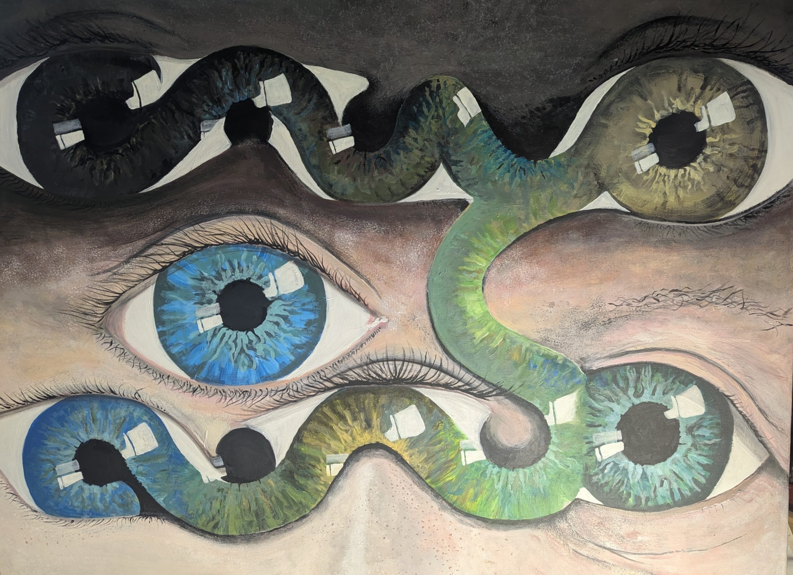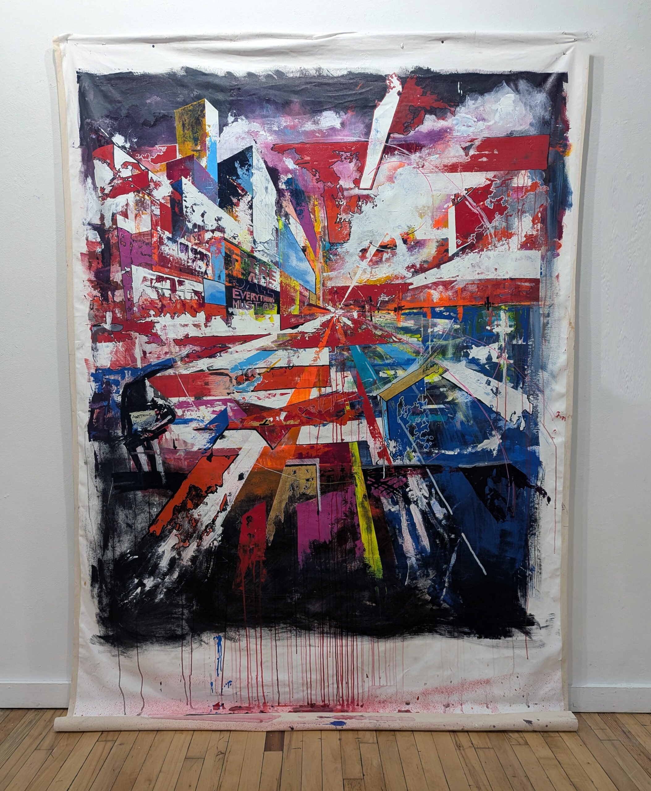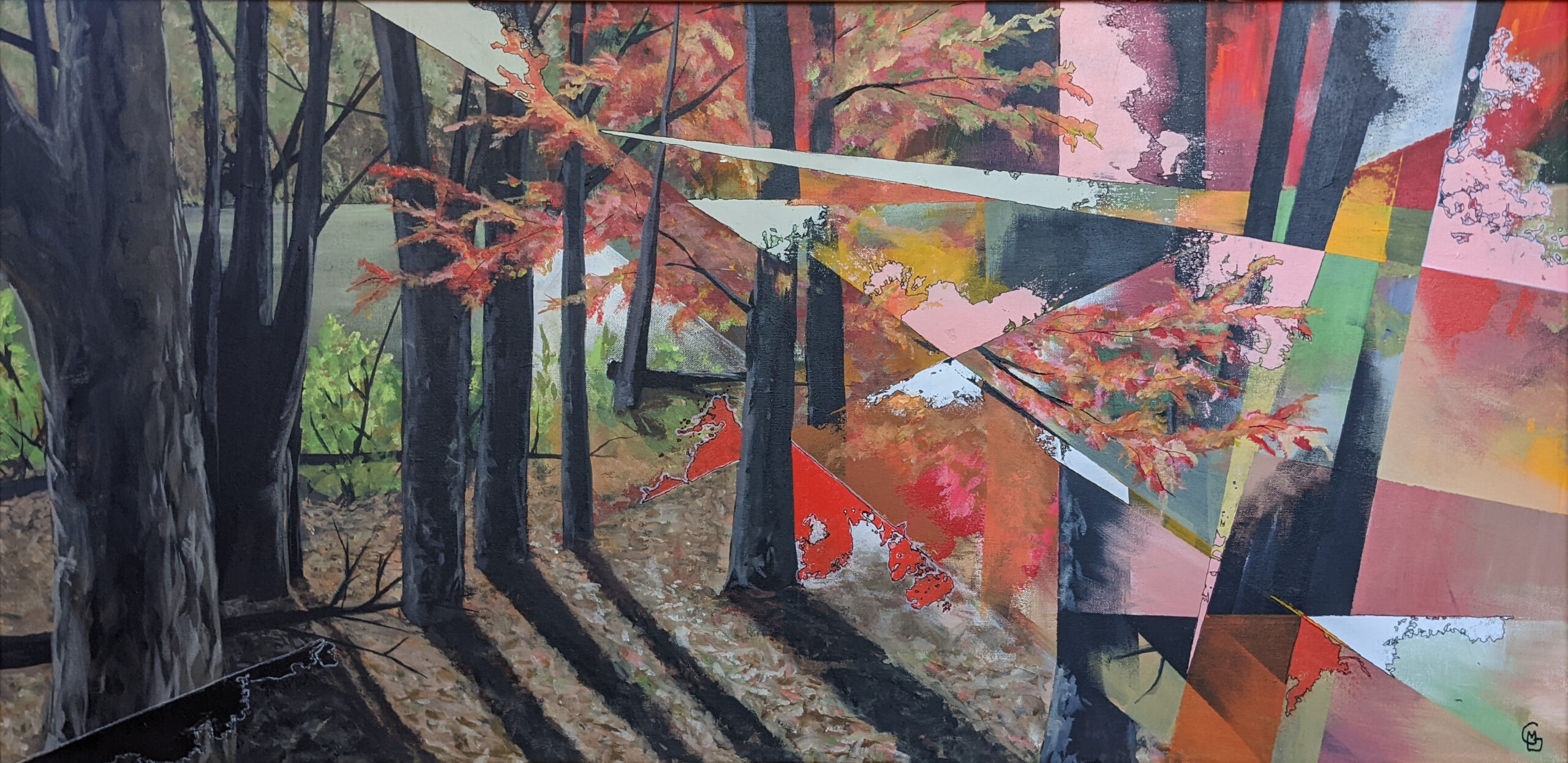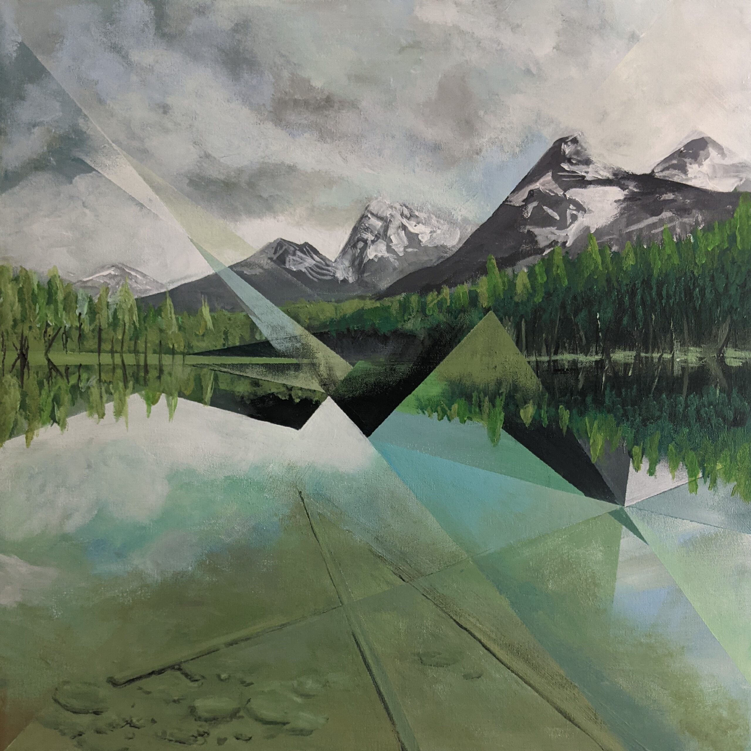 I am interested in art as a bridge. I paint geometric compositions that explore with intention along the spectrum of representation and abstraction; my attention is currently on humanity's position at the threshold of the "natural" world.