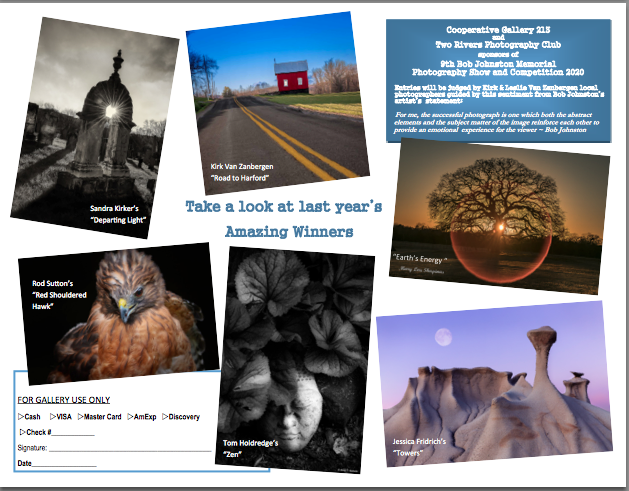 Cooperative Gallery 213 and Twin Rivers Photography Club collaborate to sponsor the 9th Annual Bob Johnston Photography Show and Competition. Any photographers can submit up to 3 photos, $10 submission fee each. Cash awards and People’s Choice Award. Download brochure on this site.