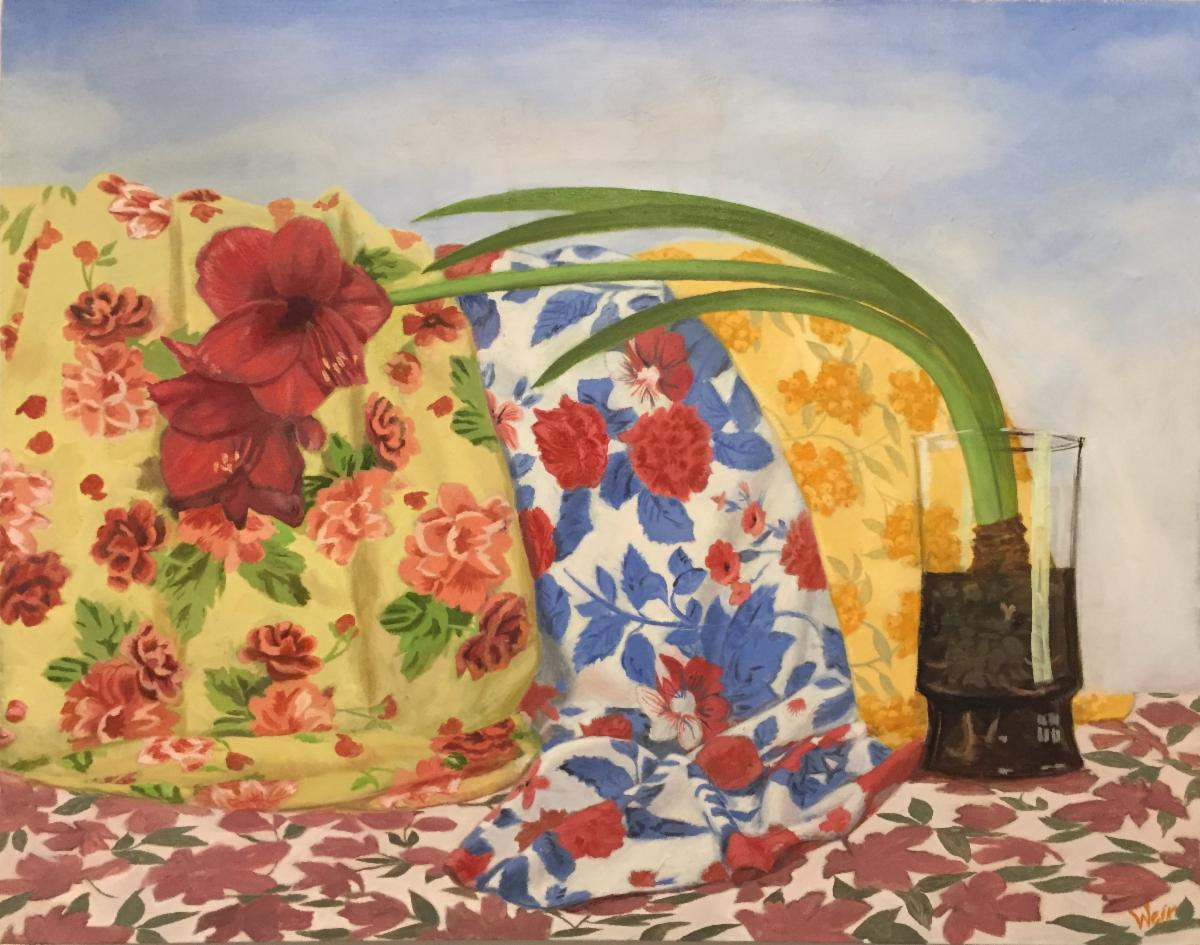 Weir’s explains, “In previous shows I’ve used figures to engage the viewer by depicting parables, stories and unlikely situations. In this show I’ve continued the theme of unusual associations, but with patterns, not people. Each still life features a collection of patterns that wouldn’t normally be juxtaposed. Unexpected collections of beautiful patterns creates a new dynamic and excitement.